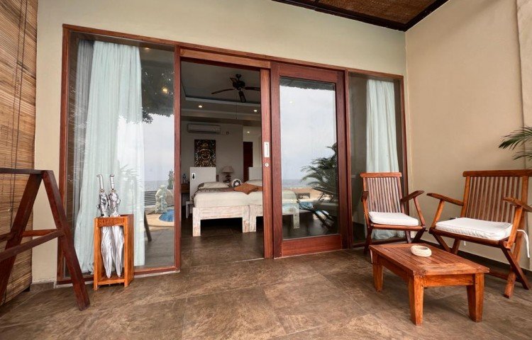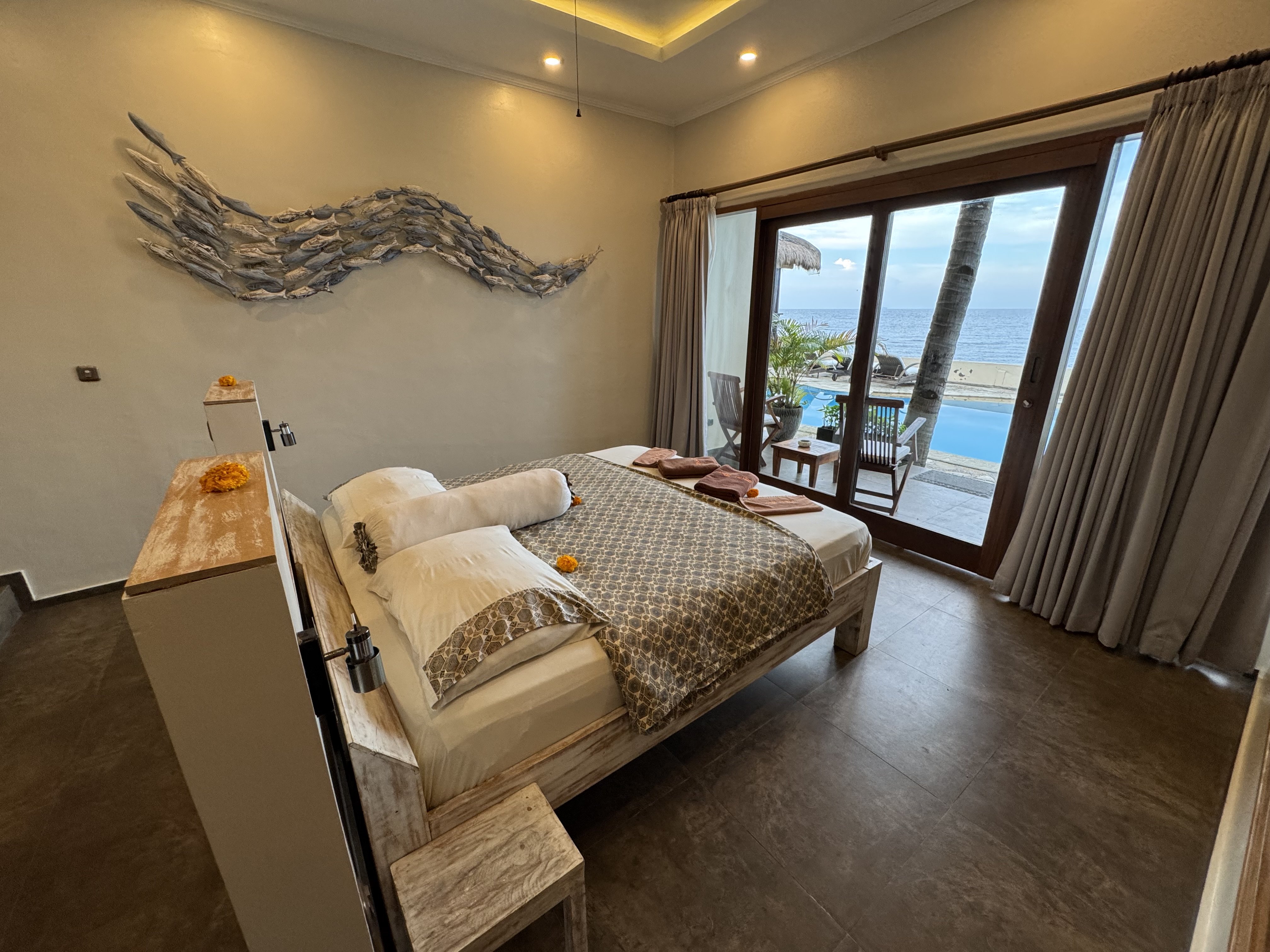 Sea view, location, clean rooms, private pool, open-air bathroom, excellent food and staff.